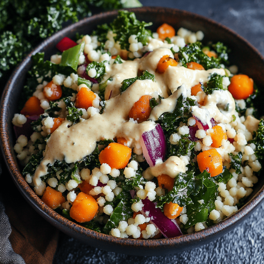Blended with lemon juice, garlic, Dijon mustard, and a touch of maple syrup, the dressing is bright, tangy, and subtly sweet—complementing the slight bitterness of kale and the nutty backdrop of couscous.